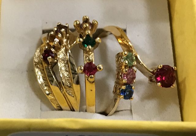 Three gold rings, sized 6 1/4 to size 7, with multi colored gemstones, all marked, "Sample". Three gold rings, sized 6 1/4 to size 7, with multi colored gemstones, all marked, "Sample".