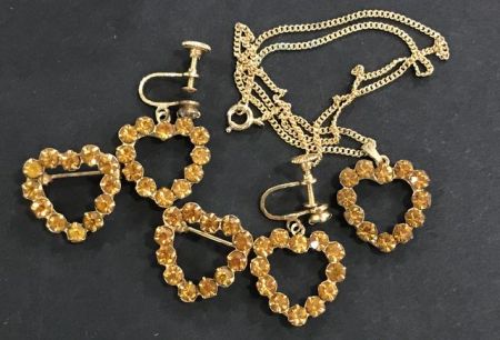 1950's Beautiful Vintage Costume Jewelry Set, necklace, two heart pins, and pair of screwback earrings, excellent shape, believed to be umarked, Albert Weiss. 1950's Beautiful Vintage Costume Jewelry Set, necklace, two heart pins, and pair of screwback earrings, excellent shape, believed to be umarked, Albert Weiss.