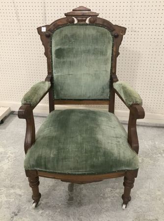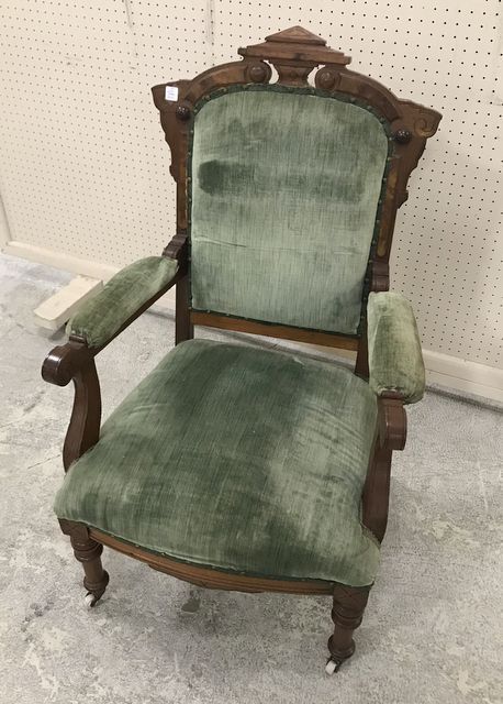 Eastlake Victorian Style Parlor Arm Chair, has age, upholstered, walnut frame, on casters, good condition. Eastlake Victorian Style Parlor Arm Chair, has age, upholstered, walnut frame, on casters, good condition.