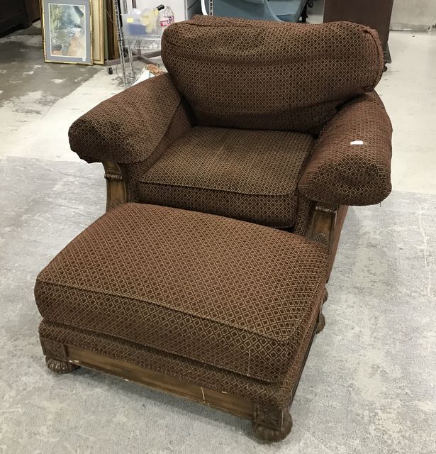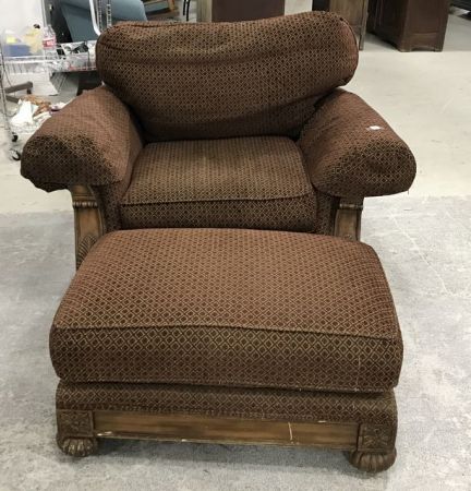 Clayton Marcus Upholstered Arm Chair and Ottoman, arm covers, french style, large chair. Clayton Marcus Upholstered Arm Chair and Ottoman, arm covers, french style, large chair.
