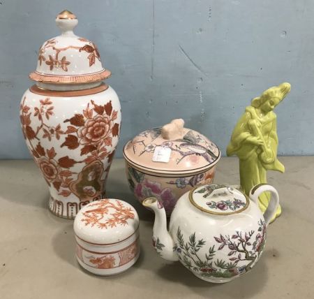 Group of Oriental Pottery Decor, Pottery Asian Figurine, Hand Painted porcelain jar 12"h., covered pot, pitcher, cannister. Group of Oriental Pottery Decor, Pottery Asian Figurine, Hand Painted porcelain jar 12"h., covered pot, pitcher, cannister.