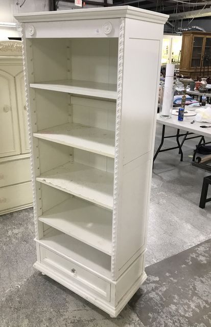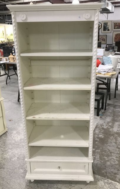 Simply Shabby Chic Painted Cabinet, display, four shelves, single drawer, footed, used, 67"h., 26"w., 15"d. Simply Shabby Chic Painted Cabinet, display, four shelves, single drawer, footed, used, 67"h., 26"w., 15"d.