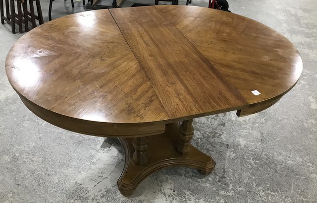 1980's-90's Round Pedestal Dining Table, oval with the single leaf, has light top scratches, and some wear, 30"h., 54"w., 42"d. 1980's-90's Round Pedestal Dining Table, oval with the single leaf, has light top scratches, and some wear, 30"h., 54"w., 42"d.