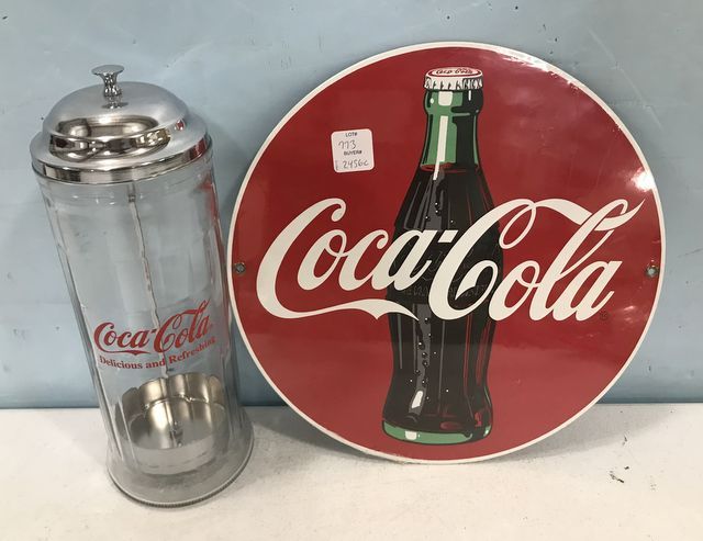 Modern Coca Cola Sign 11"dia. and Glass Straw Container 10"h. Modern Coca Cola Sign 11"dia. and Glass Straw Container 10"h.