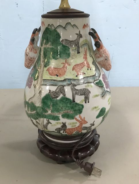 Hand Painted Porcelain Goat Head Urn Lamp, oriental wood base, good shade, 26"h. Hand Painted Porcelain Goat Head Urn Lamp, oriental wood base, good shade, 26"h.