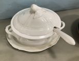 Whittler Pottery Tureen, with under plate and ladle, 12"w. Whittler Pottery Tureen, with under plate and ladle, 12"w.