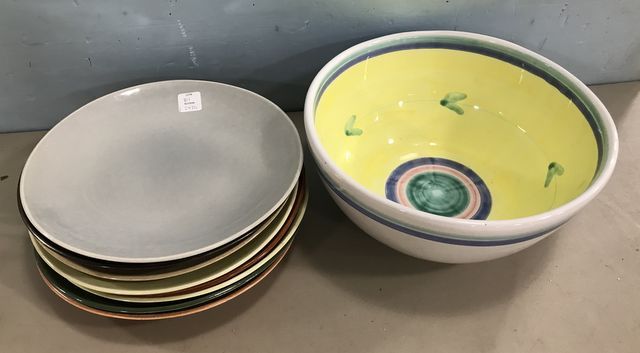 Group of Ironstone Dinner Plates 10"dia., 8 total, different colors, also included is hand painted butterfly pottery salad bowl/mixing bowl 5"h., 12"dia. Group of Ironstone Dinner Plates 10"dia., 8 total, different colors, also included is hand painted butterfly pottery salad bowl/mixing bowl 5"h., 12"dia.