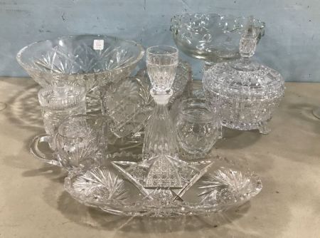 Group of Pressed and Etched Glassware, clear glass compote, etched glass bowl, round bowl, tray, candy dish, creamer, condiment jar. Group of Pressed and Etched Glassware, clear glass compote, etched glass bowl, round bowl, tray, candy dish, creamer, condiment jar.