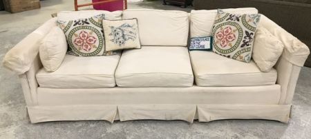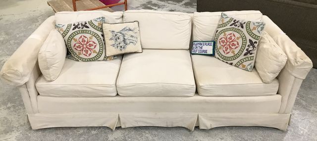 White Upholstered Three Cushion Sofa, cushion covers are removable, has dirt stains, needs cleaning, 7". White Upholstered Three Cushion Sofa, cushion covers are removable, has dirt stains, needs cleaning, 7".