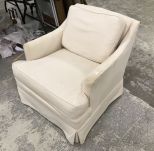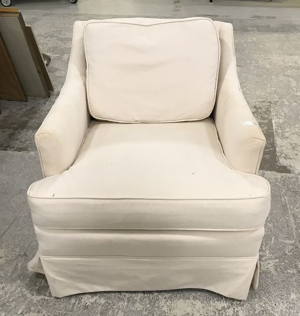 White Upholstered Arm Chair, cushion covers are removable, has dirt stains, needs cleaning. White Upholstered Arm Chair, cushion covers are removable, has dirt stains, needs cleaning.