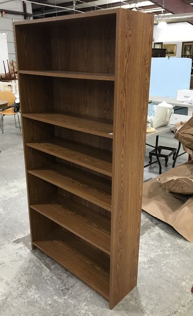 Pressed Wood Oak Finish Bookcase, five shelves, 72"h., 36"w., 12"d. Pressed Wood Oak Finish Bookcase, five shelves, 72"h., 36"w., 12"d.