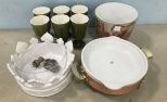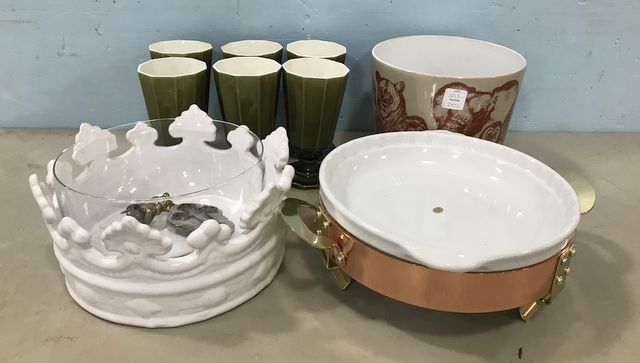 Secla ceramic brown cups (6), white ceramic centerpiece, brass stand ceramic dish, planter. Secla ceramic brown cups (6), white ceramic centerpiece, brass stand ceramic dish, planter.
