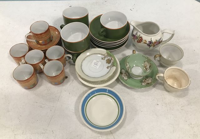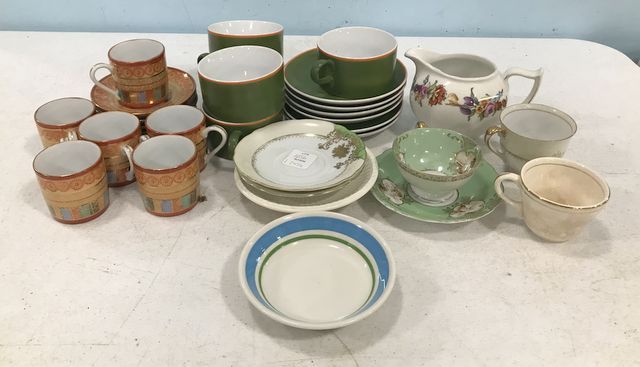 Andrea Porcelain hand painted cups and saucers, Porcelain green cups and saucers, Bavaria pitcher, Occupied Japan saucers, and cups. Andrea Porcelain hand painted cups and saucers, Porcelain green cups and saucers, Bavaria pitcher, Occupied Japan saucers, and cups.