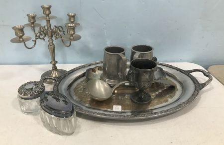 1057 Handled Silverplate Tray, Pewter Mugs, Silver Plate, and Metal Candle Holder