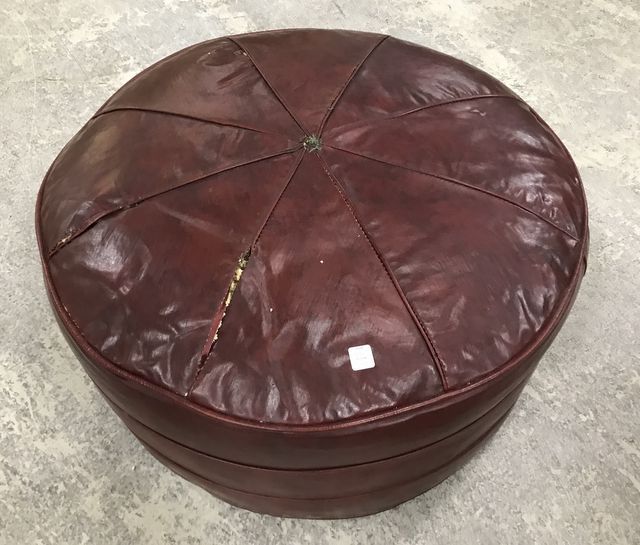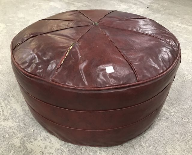 Round Vinyl Ottoman, has loose seams, missing center button, 13"h., 30"dia. Round Vinyl Ottoman, has loose seams, missing center button, 13"h., 30"dia.