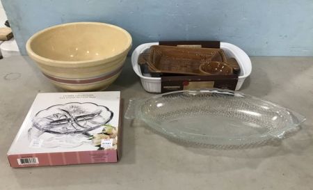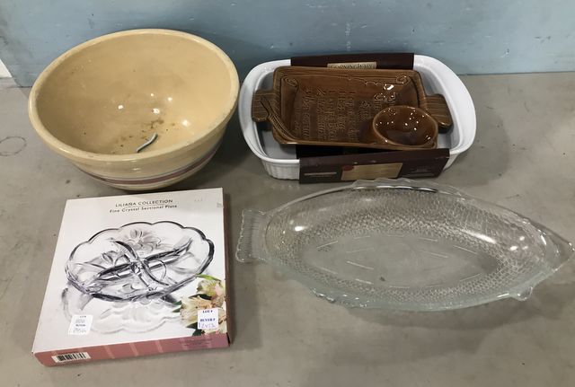New Corning Ware Baking Dish, Crystal Sectional Plate, Labeled Stoneware Bowl, Pottery Tray, and Glass Fish Dish. New Corning Ware Baking Dish, Crystal Sectional Plate, Labeled Stoneware Bowl, Pottery Tray, and Glass Fish Dish.