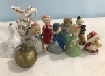 Ceramic hand painted vase, metal apple, ceramic bell, 7 ceramic figurines. Ceramic hand painted vase, metal apple, ceramic bell, 7 ceramic figurines.