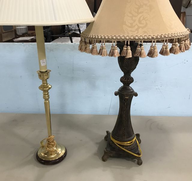 Brass pole lamp with shade, 38"h., rustic resin column lamp, has crack in neck, has shade, 36"h. Brass pole lamp with shade, 38"h., rustic resin column lamp, has crack in neck, has shade, 36"h.