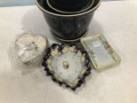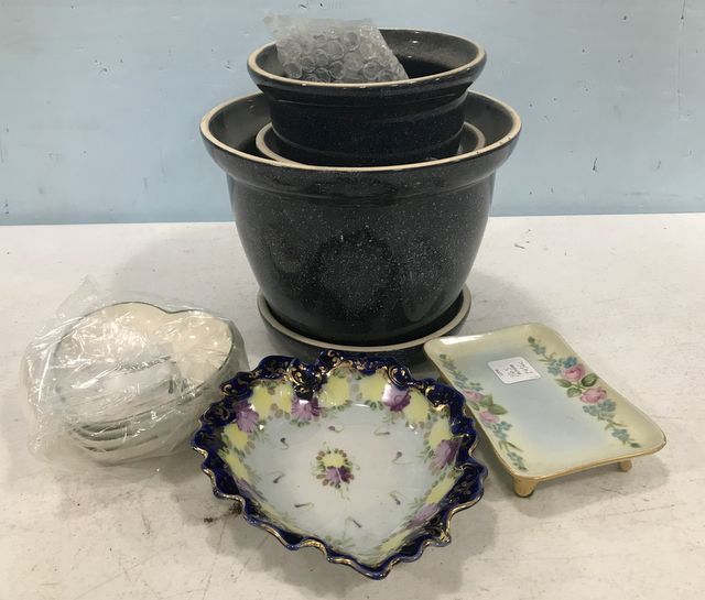 Porcelain Dishes, hand painted dish, Christmas china heart dishes, B & C France footed dish, and Pottery Assorted Sized Planters Porcelain Dishes, hand painted dish, Christmas china heart dishes, B & C France footed dish, and Pottery Assorted Sized Planters