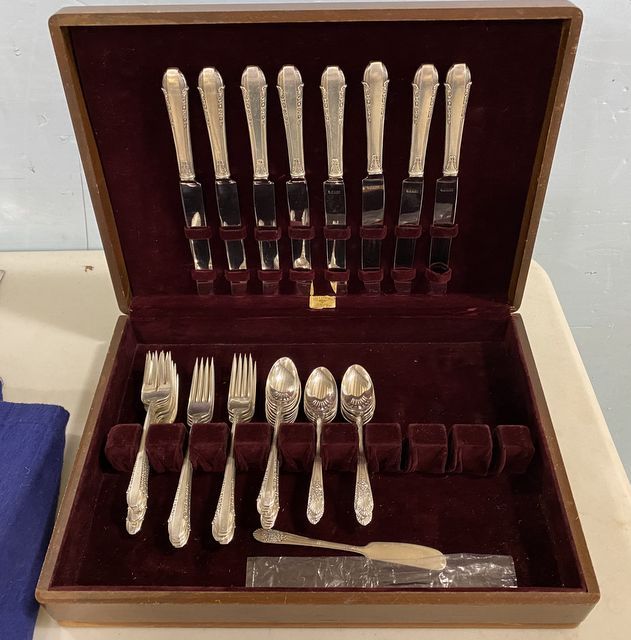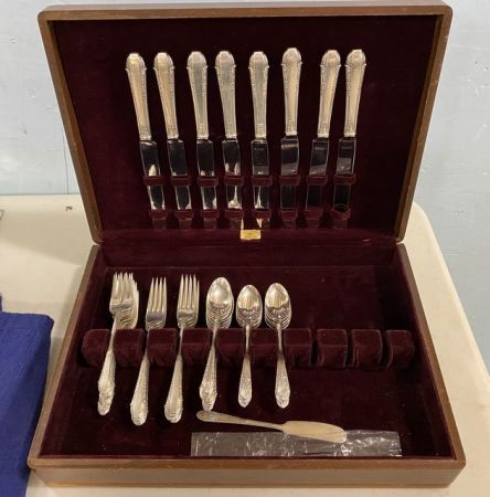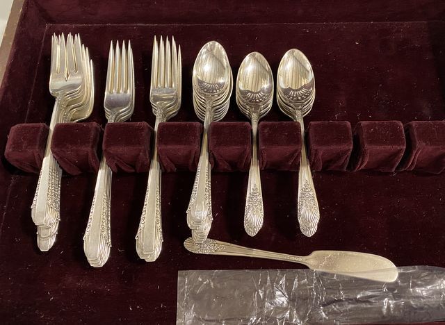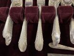 International "Enchantress" Sterling Flatware, 8 salad forks, 8 dinner forks, 20 spoons, 8 knives, butter knife, 38.675 (knives not included in weight), International "Enchantress" Sterling Flatware, 8 salad forks, 8 dinner forks, 20 spoons, 8 knives, butter knife, 38.675 (knives not included in weight),