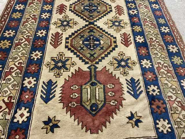 Hand Woven Wool Area Rug 5'1 x 8'3, cream, blue, burgundy, good condition. Hand Woven Wool Area Rug 5'1 x 8'3, cream, blue, burgundy, good condition.