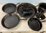 Group of Cast Iron Skillets and Pot, some Lodge, assorted sized, good condition, corn bread pan, handled pot. Group of Cast Iron Skillets and Pot, some Lodge, assorted sized, good condition, corn bread pan, handled pot.