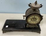 Vintage S & F French Mantle Clock, missing figural statue, metal ormolu, has pendulum, untested, 15"h., 19"w. Vintage S & F French Mantle Clock, missing figural statue, metal ormolu, has pendulum, untested, 15"h., 19"w.