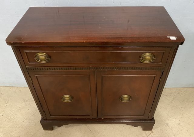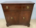 Mahogany Duncan Phyfe Server, Mid 1900s, single drawer, double door, has finish scratches, 34"h., 35"w., 16"d. Mahogany Duncan Phyfe Server, Mid 1900s, single drawer, double door, has finish scratches, 34"h., 35"w., 16"d.