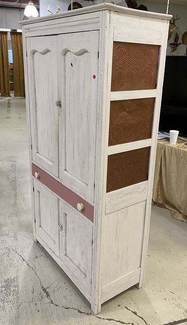 Vintage Painted White Pie Safe Cabinet, tin sides, four door, white painted with pink drawer, wood shelves, 69"h., 37", 16"d. Vintage Painted White Pie Safe Cabinet, tin sides, four door, white painted with pink drawer, wood shelves, 69"h., 37", 16"d.