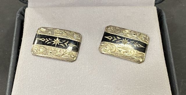 Sterling cuff links, etched design, vintage, in case. Sterling cuff links, etched design, vintage, in case.