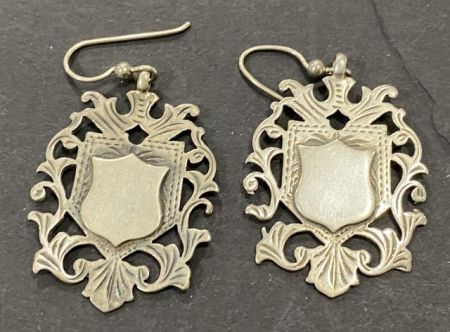 Sterling Family Shield Earrings, English mark, not monogrammed, 1 1/2"h. Sterling Family Shield Earrings, English mark, not monogrammed, 1 1/2"h.