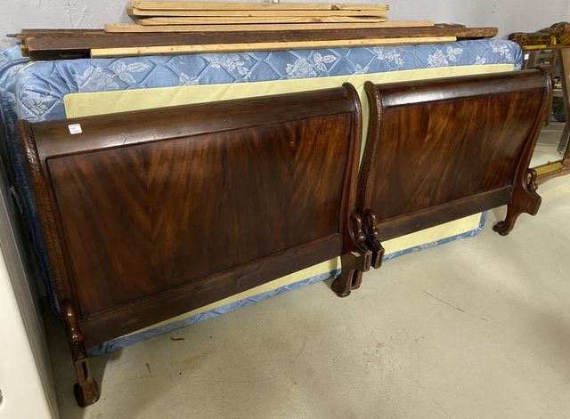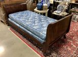French Style Swan Day Bed, burl mahogany, made in France, paw footed, light wear, comes with mattress and box spring, has pictures with it together. French Style Swan Day Bed, burl mahogany, made in France, paw footed, light wear, comes with mattress and box spring, has pictures with it together.