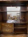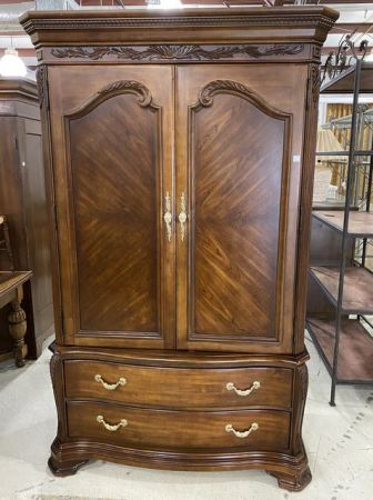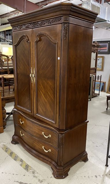 Bob Mackie Home by American Drew Tv Armoire, antique reproduction style, cherry, two piece, two drawers, good condition, has power plug, 85"h., 50"w., 23"d. Bob Mackie Home by American Drew Tv Armoire, antique reproduction style, cherry, two piece, two drawers, good condition, has power plug, 85"h., 50"w., 23"d.