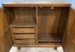 Late 20th Century Mid Century Modern Double Door Cabinet, oak finish, drawers and shelves, has light wear, 46"h., 48"w., 18"d. Late 20th Century Mid Century Modern Double Door Cabinet, oak finish, drawers and shelves, has light wear, 46"h., 48"w., 18"d.