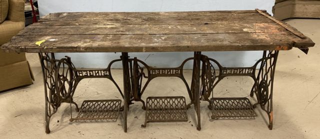 Large Antique Hand Made Sewing Machine Base Table, rustic antique metal singer sewing machine bases, rustic aged wood top, does need some work, 29"h., 79"w., 30"d. Large Antique Hand Made Sewing Machine Base Table, rustic antique metal singer sewing machine bases, rustic aged wood top, does need some work, 29"h., 79"w., 30"d.