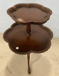 Early 1900's Mahogany Two Tier Pedestal Table, ornate carved boarder, has one loose trim piece and one leg needs tightening, pegs have become loose, 33"h., 24"dia. Early 1900's Mahogany Two Tier Pedestal Table, ornate carved boarder, has one loose trim piece and one leg needs tightening, pegs have become loose, 33"h., 24"dia.