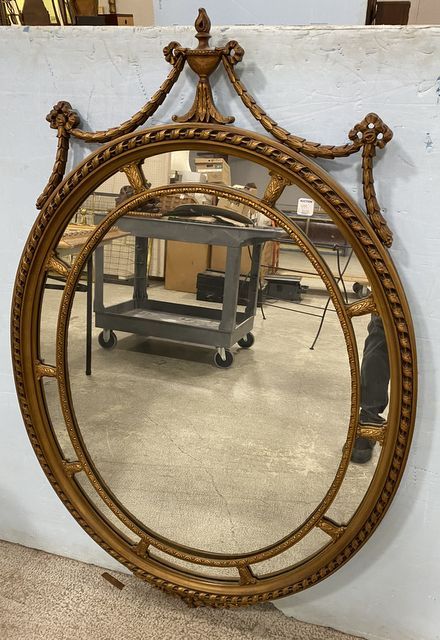 Vintage French Gold Gilt Wood Wall Mirror, ribbon crest, good condition, 49"h., 32"w. Vintage French Gold Gilt Wood Wall Mirror, ribbon crest, good condition, 49"h., 32"w.