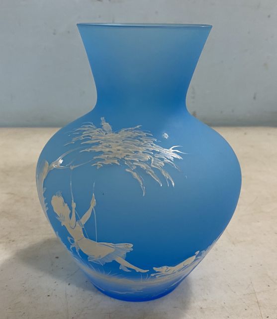 Mary Gregory Blue Art Vase Signed E. Brown 1972, hand painted children playing, 7"h. Mary Gregory Blue Art Vase Signed E. Brown 1972, hand painted children playing, 7"h.
