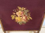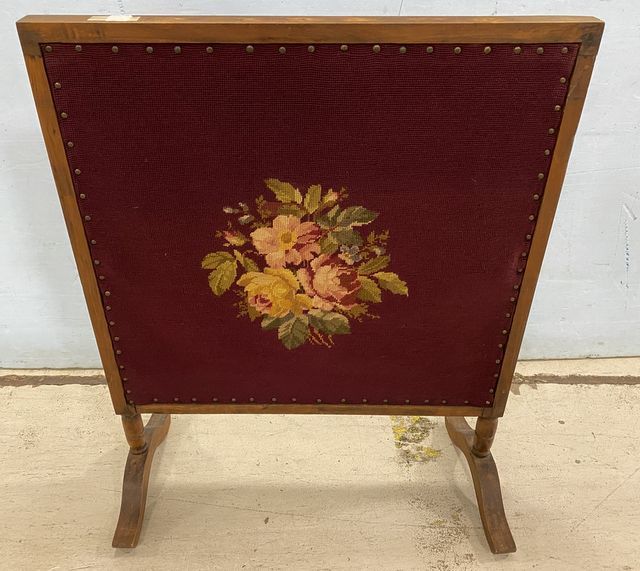 Antique needle point fire screen, wood framed, floral still life, 32"h., 26"w. Antique needle point fire screen, wood framed, floral still life, 32"h., 26"w.