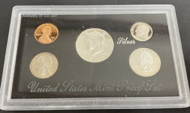 United States Mint Silver Proof Set 1997, Cent, Nickel, Dime 90%, Quarter 90%, Half Dollar 90%. United States Mint Silver Proof Set 1997, Cent, Nickel, Dime 90%, Quarter 90%, Half Dollar 90%.