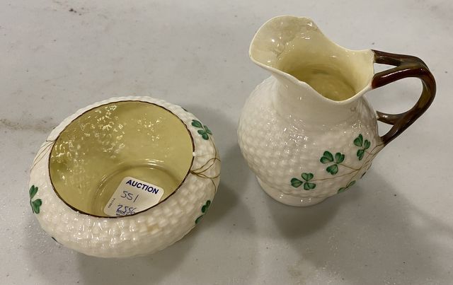 Belleek Eggshell Pitcher and Bowl, 4"h., made in Ireland, bowl has small rim chip. Belleek Eggshell Pitcher and Bowl, 4"h., made in Ireland, bowl has small rim chip.