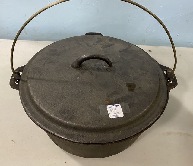 Cast Iron Covered Cooking Pot, metal handle, 5"h., 13"dia. Cast Iron Covered Cooking Pot, metal handle, 5"h., 13"dia.