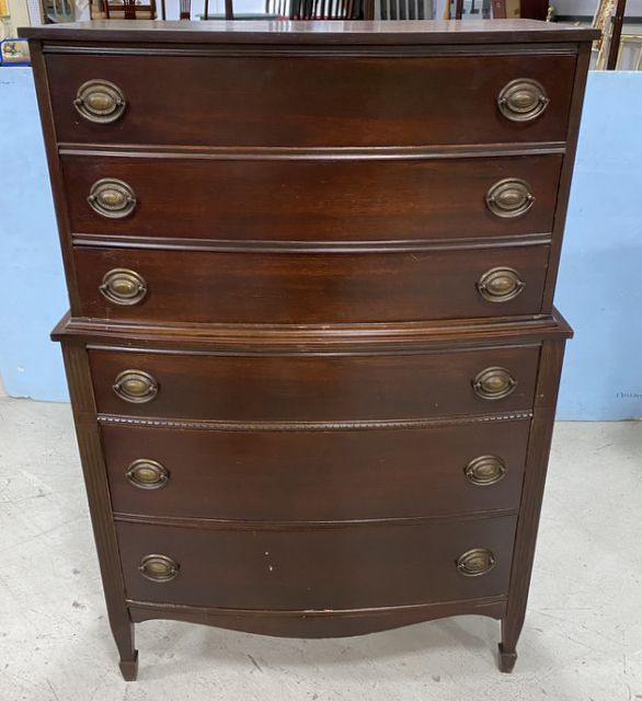 Mahogany Duncan Phyfe Chest on Chest, 6 drawers, back leg has a split, has finish wear, 54"h., 36"w., 18"d. Mahogany Duncan Phyfe Chest on Chest, 6 drawers, back leg has a split, has finish wear, 54"h., 36"w., 18"d.