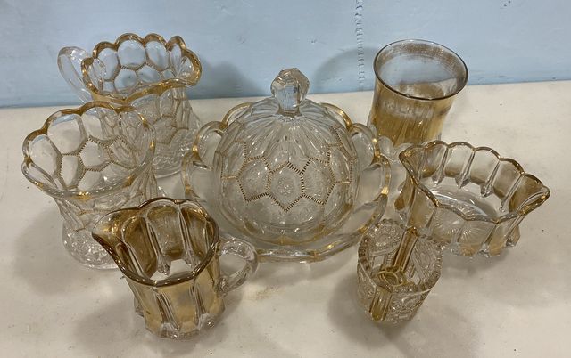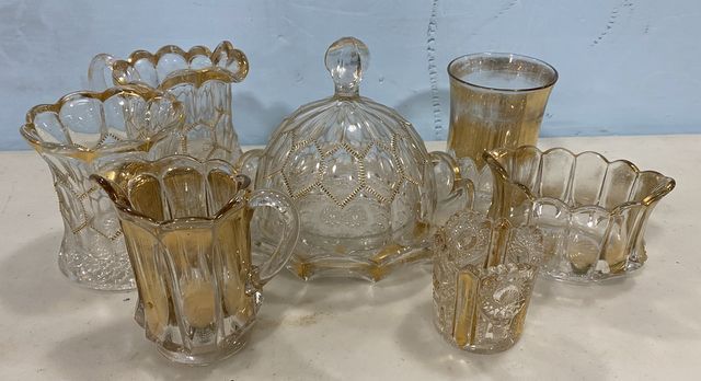 Mid Century Gold and Glass Pieces, covered cheese dish, pitchers, vase, bowl. Mid Century Gold and Glass Pieces, covered cheese dish, pitchers, vase, bowl.
