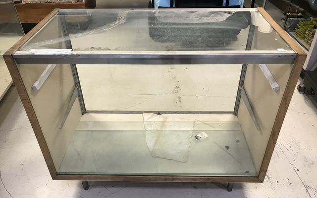 Vintage Glass Display Case, two glass shelves, has crack top glass, no doors, not heavy, 40"h., 48"w., 23"d. Vintage Glass Display Case, two glass shelves, has crack top glass, no doors, not heavy, 40"h., 48"w., 23"d.