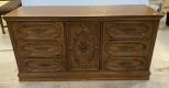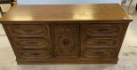 Vintage double dresser, oak finish, 6 drawers, center door, has finish wear, includes single back mirror, 32"h., 62"w., 19"d. Vintage double dresser, oak finish, 6 drawers, center door, has finish wear, includes single back mirror, 32"h., 62"w., 19"d.