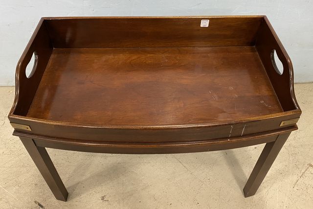 Brandt Furniture Company Table Tray, mahogany, has wear, handled, brass accent, 21"h., 28"w. Brandt Furniture Company Table Tray, mahogany, has wear, handled, brass accent, 21"h., 28"w.