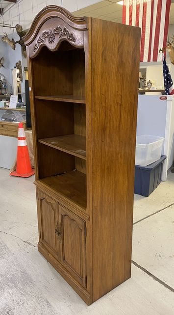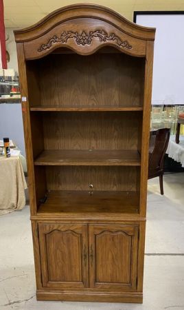 Thomasville Oak Finish Bookcase, open front, two shelves, double doors, lighted, 80"h., 32"w., 17"d. Thomasville Oak Finish Bookcase, open front, two shelves, double doors, lighted, 80"h., 32"w., 17"d.