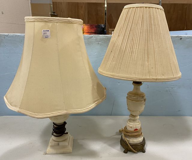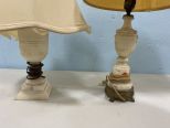 Two Alabaster Pedestal lamps, one with ornate metal footed base, has shades, 22"h. Two Alabaster Pedestal lamps, one with ornate metal footed base, has shades, 22"h.