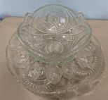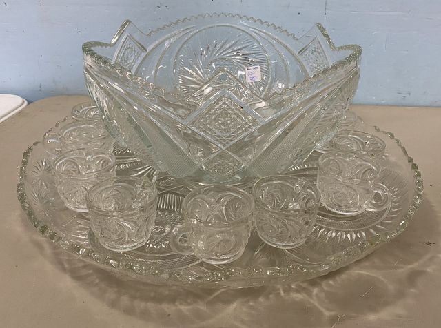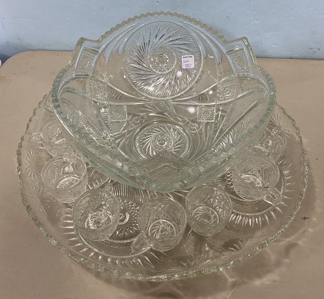 Vintage Pressed Glass Pinwheel Punch Bowl, underplate 21"dia., 10 punch cups. Vintage Pressed Glass Pinwheel Punch Bowl, underplate 21"dia., 10 punch cups.